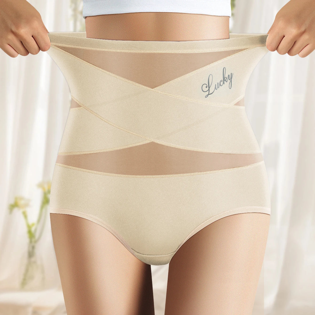 High Waisted Women's Panties Breathable Mesh Cross Tummy Cinching Ice Silk No Trace Triangle Panties Tummy Tuck Shape